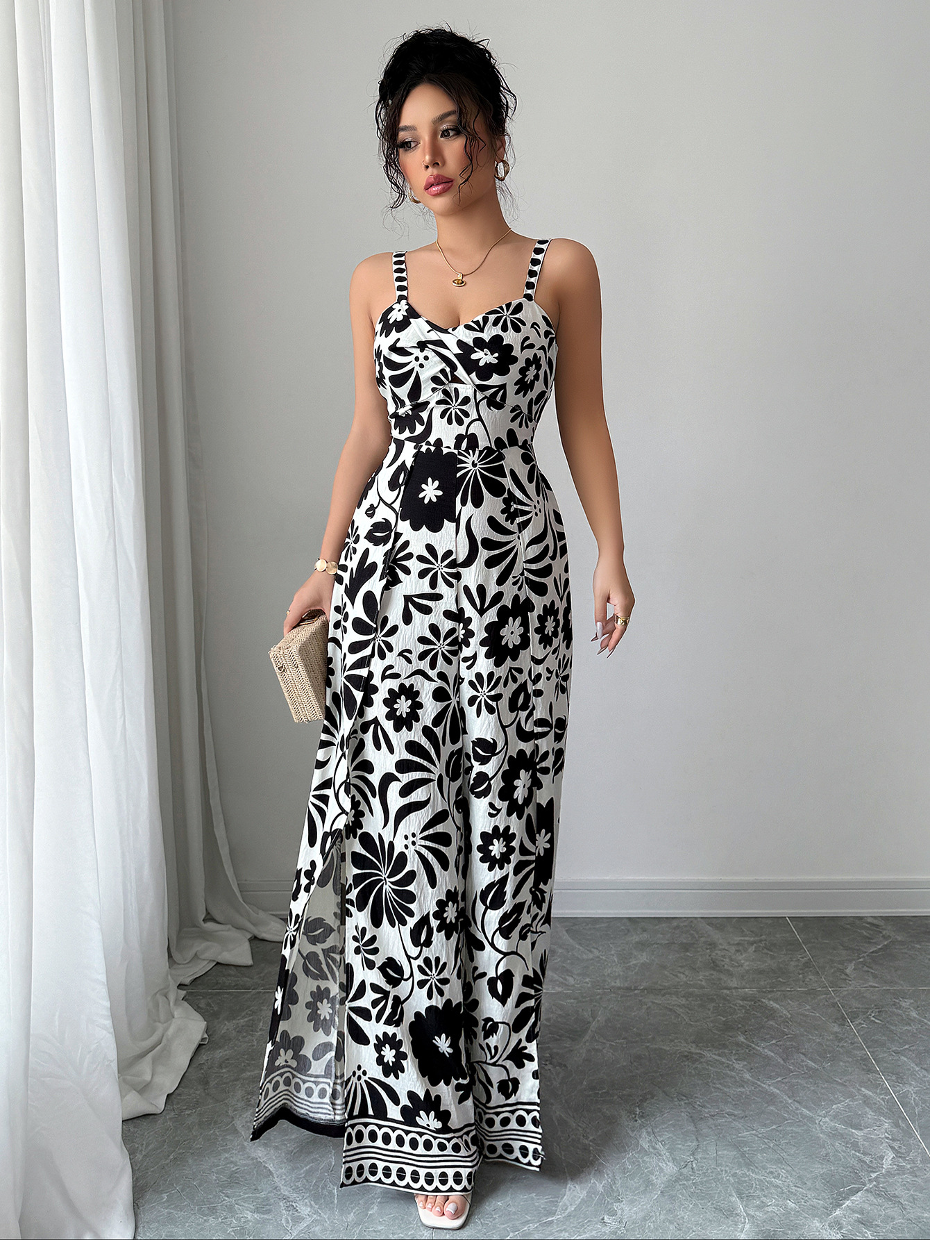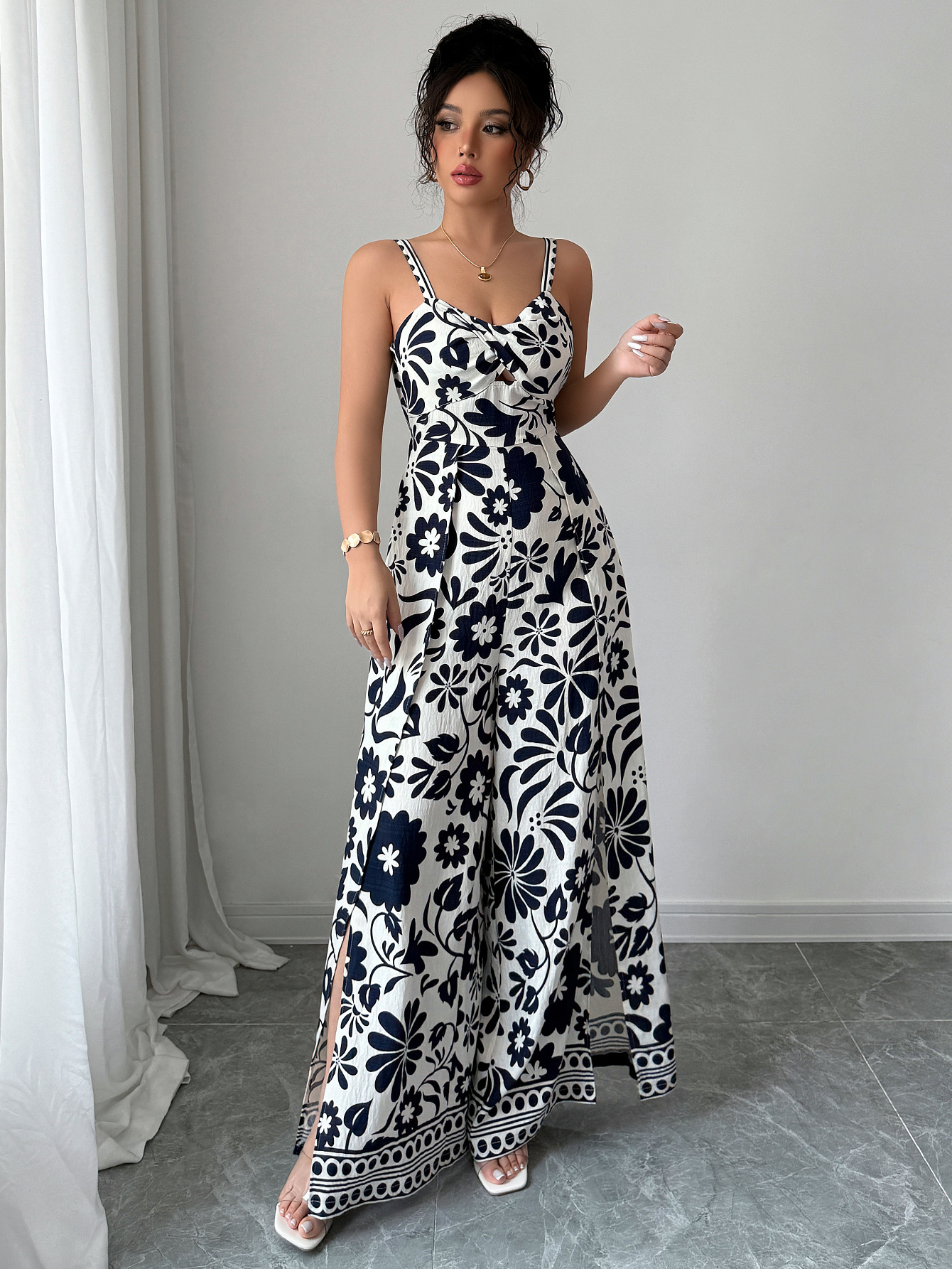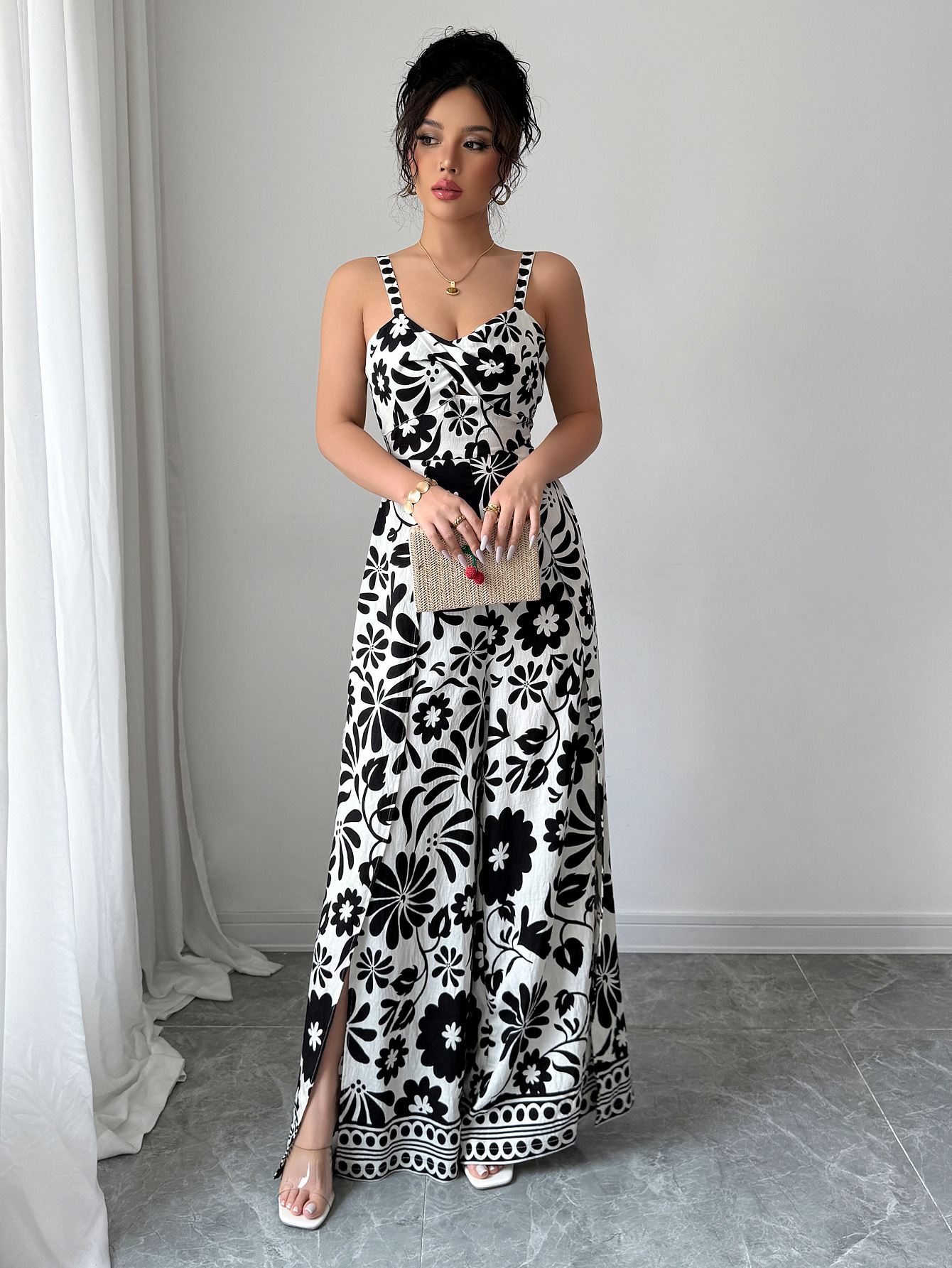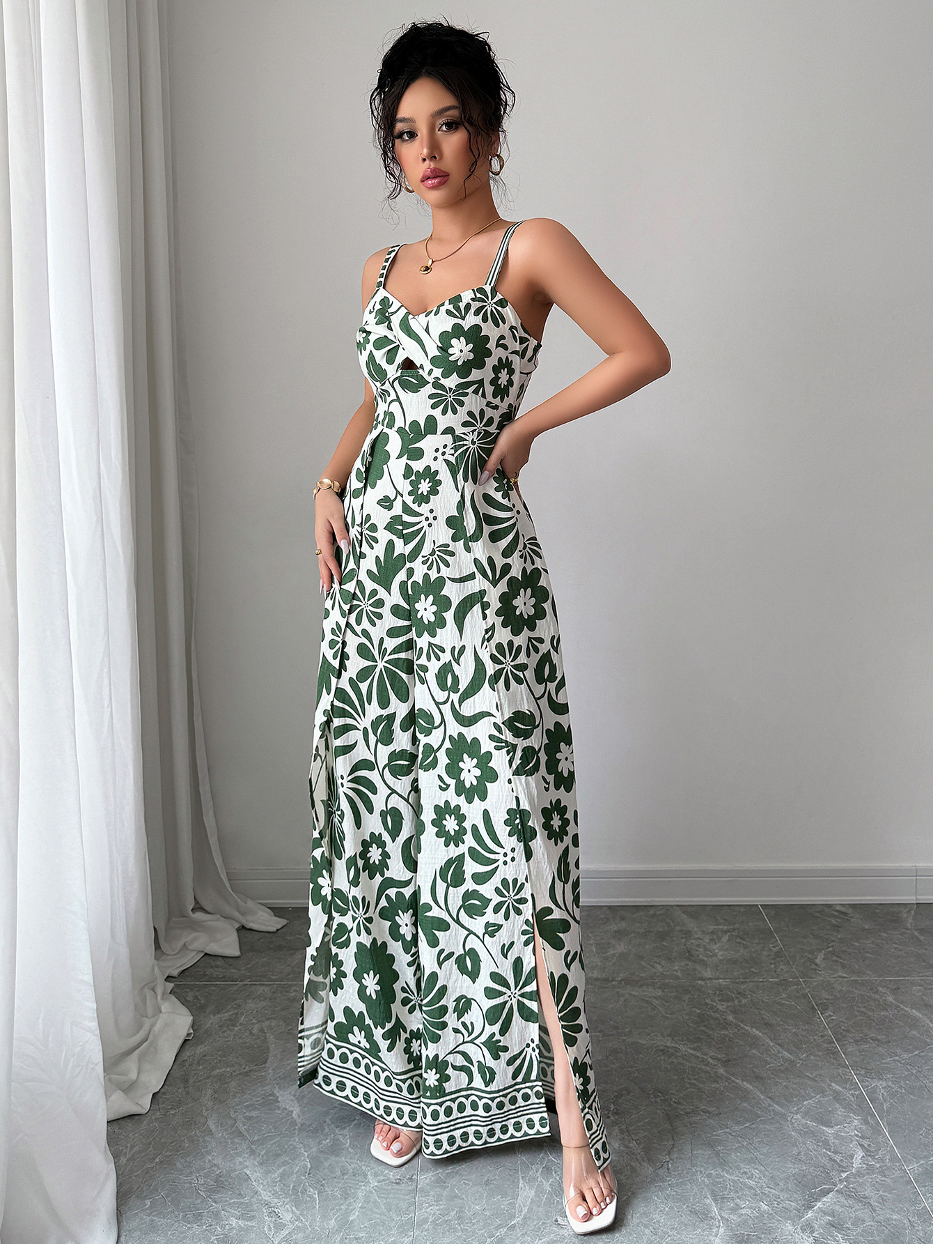 Elegant Graceful Printed Suspender Long Dress Women's Dress