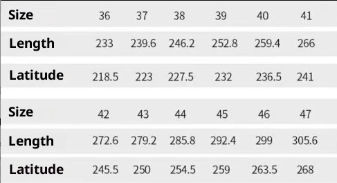 Size: 36, 37, 38, 39, 40, 41, 42, 43, 44, 45, 46, 47, 48